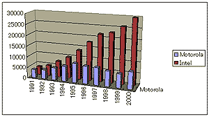 単位:Mドル MSC調べ1991年までモトローラはインテルを凌ぐ全米第一位(世界第4位)の半導体メーカであり、1992年まではインテルの好敵手だった。しかし、その後インテルとモトローラの売上の差は開く一方となり、特に1996年以降、両社の業績は明暗を分ける結果となった。とはいっても、モトローラの半導体部門が業界全体の成長率に比較して際立って悪かったわけではない。インテルの成長率がモトローラを含む他社を圧倒したとも云うこともできる。